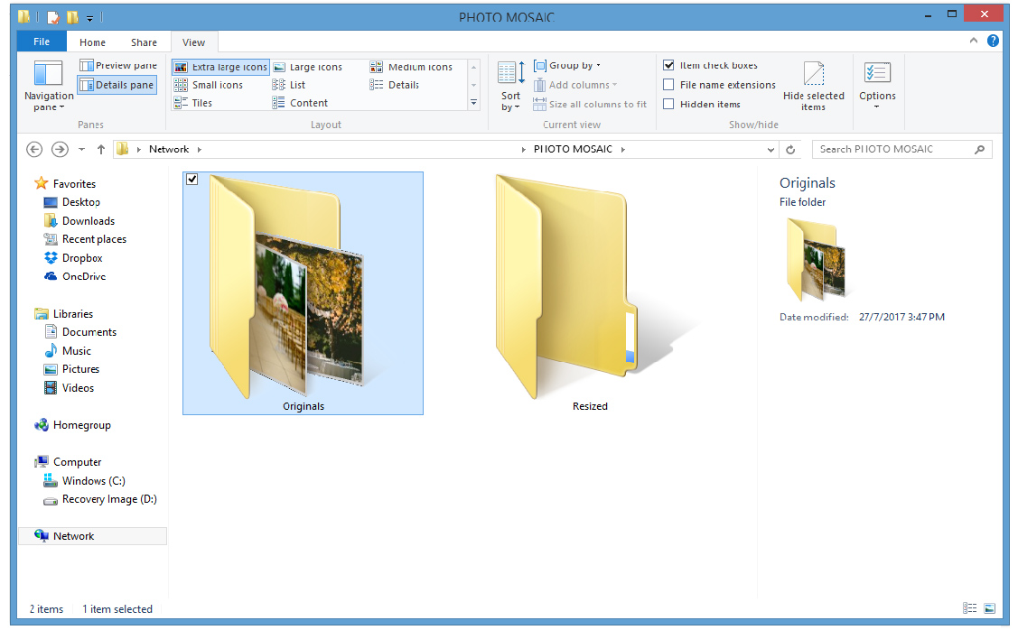 The first step would be to get all the photos (for the mosaic background) into one folder, then create another empty folder for the resized photos. Also have the final photo you want to show ready!